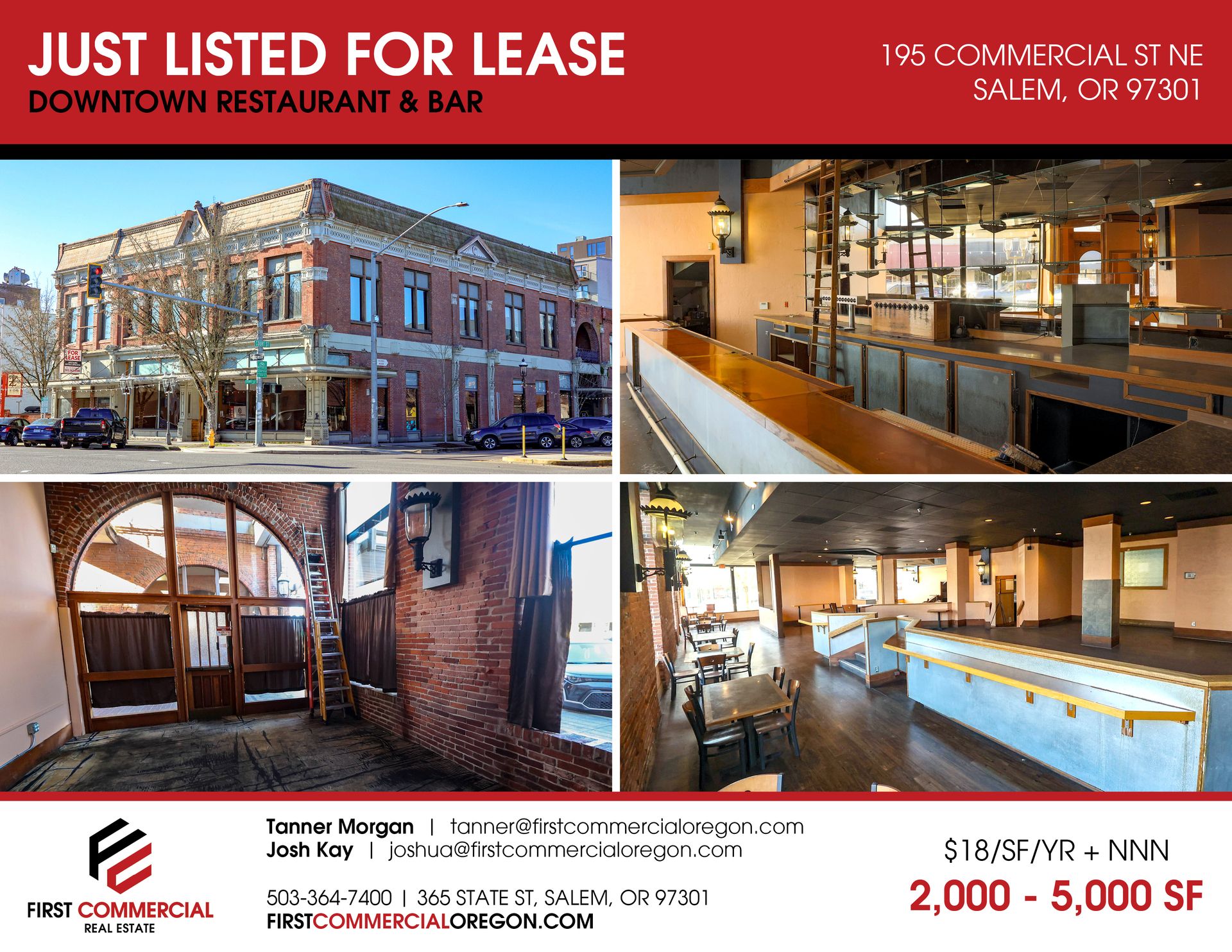 Formerly Night Deposit, this ≈5,000 SF turnkey restaurant and bar space is ideally positioned along Commercial Street in the heart of downtown Salem, offering strong visibility, consistent daily traffic, and active pedestrian flow. The space includes approximately ≈900 SF of basement storage and features existing restaurant infrastructure—including a commercial hood—two points of egress, a crawl space for plumbing flexibility, and a drop ceiling for efficient utility access, creating a rare opportunity to activate a built-out space in one of downtown’s most dynamic corridors.